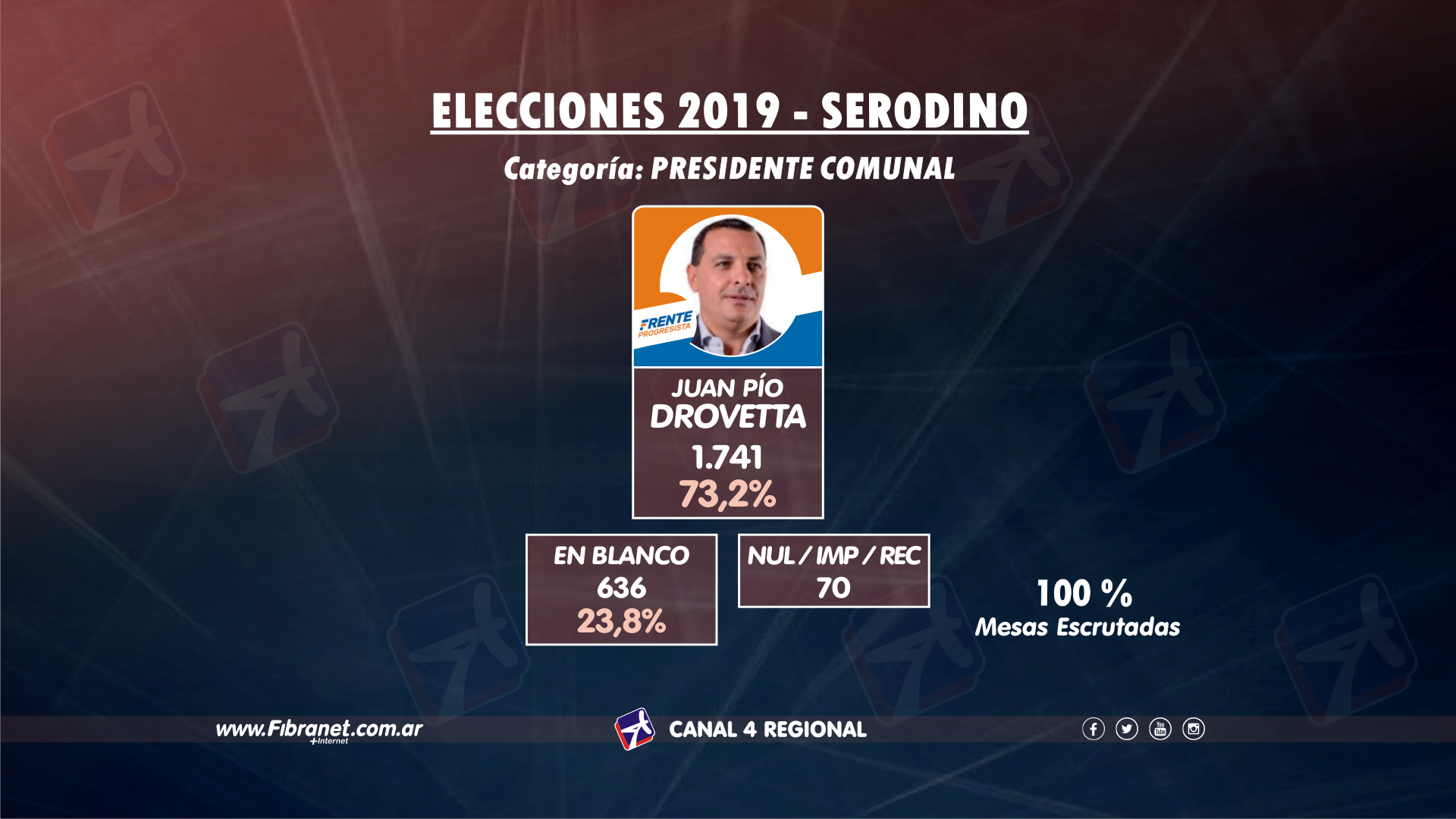Únicamente para cumplir fueron las elecciones en Serodino ya que la única lista presentada fue la del actual presidente comunal Juan Pío Drovetta, representante del Frente Progresista Cívico y Social, quien obtuvo algo el respaldo de poco más del 73% de las voluntades ciudadanas, en una jornada donde lo único comentado tanto en la Escuela n° 257 “General San Martín” como en la n° 258 “Domingo F. Sarmiento” fue el apagón que dejó sin servicio eléctrico a gran parte de la Argentina y a países limítrofes.